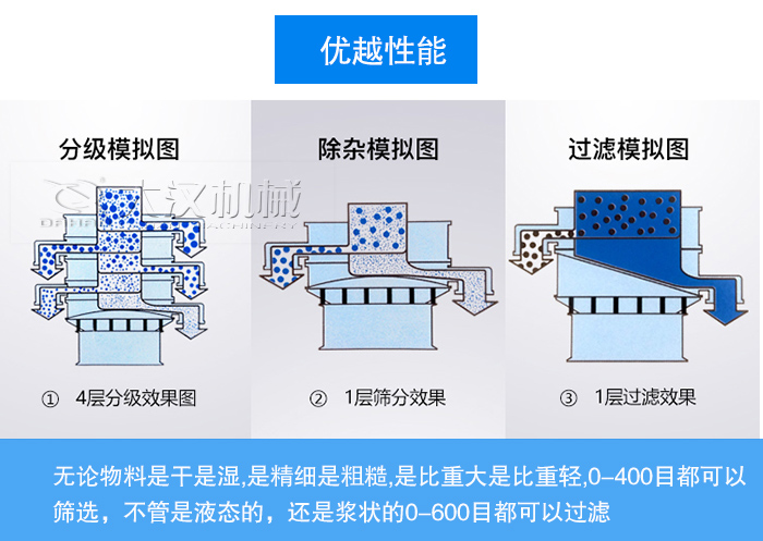 我們的不銹鋼旋振篩采用"強力"新型動力激振器,三維動力更加突出,無論物料是干是濕,是精細(xì)是粗糙,是比重大是比重輕,0-400目都可以篩選,不管是液態(tài)的,還是漿狀的0-600目都可以過濾,旋振篩系列產(chǎn)品同時配備專門的篩網(wǎng)清理裝置,把堵網(wǎng)率降到低,我們還可根據(jù)客戶需求設(shè)計特殊型號,讓用戶有更多的選擇。
