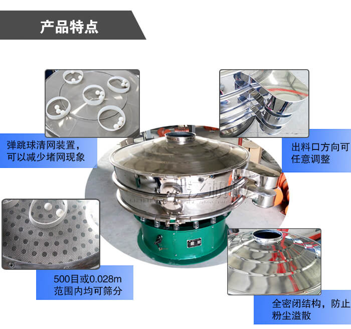 4、采用全密閉結(jié)構(gòu),防止粉塵溢散,液體飛濺,篩分效率高,還有專門的清網(wǎng)裝置,可減少物料在篩分的過程中的堵網(wǎng)現(xiàn)象,進(jìn)一步提高其篩分效率;