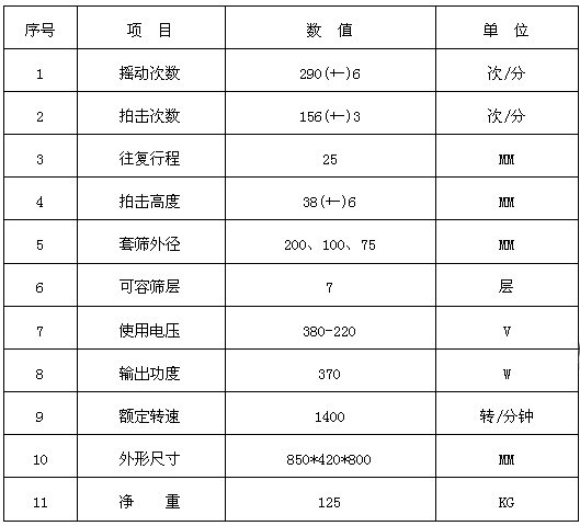 二、齒輪式拍擊篩技術(shù)參數(shù):本機(jī)符合國(guó)際標(biāo)準(zhǔn)要求(見(jiàn)表一)