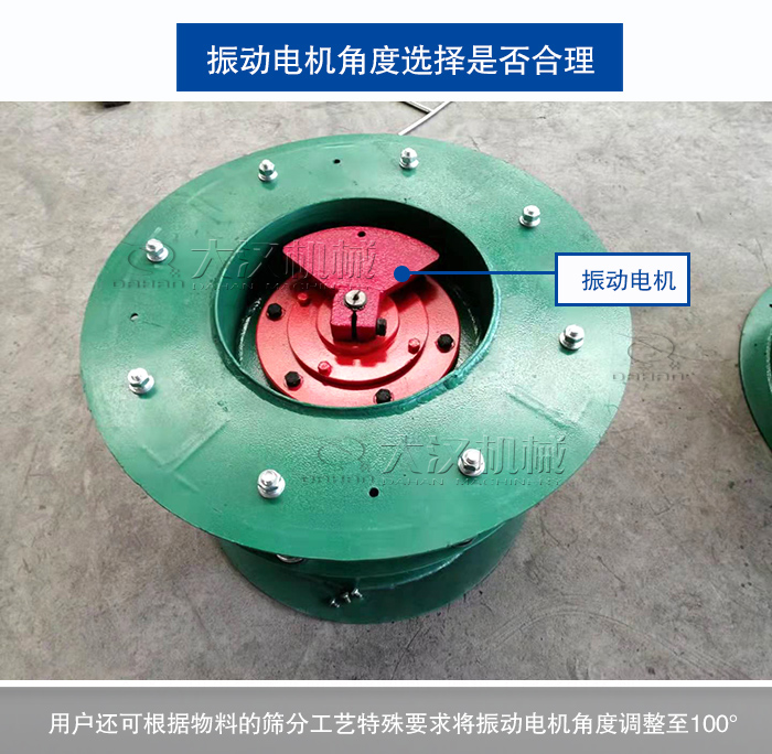 超聲波旋振篩振動(dòng)電機(jī)上下兩端的偏心塊角度越小,物料在篩面上運(yùn)轉(zhuǎn)向外散開(kāi)的越快,角度變大,物料向外散開(kāi)的越慢。一般情況下振動(dòng)篩出廠時(shí)電機(jī)角度為45°,用戶還可以根據(jù)其物料的篩分工藝特殊要求將振動(dòng)電機(jī)角度調(diào)整至100°,物料則向篩網(wǎng)中央集中。需要根據(jù)不同物料進(jìn)行調(diào)整。