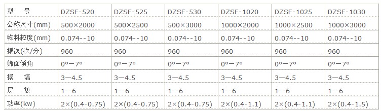 一、工作原理 DZSF系列直線振動篩為雙振動電機驅(qū)動。當兩臺振動電機做同步、反向旋轉(zhuǎn)時,其偏心塊所產(chǎn)生的激振力在平行于電機軸線的方向相互抵消,在垂直于電機軸的方向疊為一合力,因此篩機的運動軌跡為一直線。兩電機軸相對篩面在垂直方向有一傾角,在激振力和物料自重力的合力作用下,物料在篩面上被拋起跳躍或向前作直線運動,從而達到對物料進行篩選和分級的目的。適用于粒度在0.074—5mm,含水量小于7%,無粘性的各種干式粉狀或顆粒狀物料的篩分。大給料粒度不大于10mm.。 二、工作特點 該產(chǎn)品篩分精度高、處理量大、結(jié)構(gòu)簡單、耗能少、噪音低、篩網(wǎng)使用壽命長、密封性好、無粉塵溢散、維修方便、可用于流水線生產(chǎn)中的自動化作業(yè)。 三、主要適用行業(yè) 該產(chǎn)品廣泛適用于化工、食品、塑料、醫(yī)藥、冶金、玻璃、建材、糧食、化肥、磨料、陶瓷等行業(yè)中干式粉狀物料的篩分。 四、型號說明 D----------------------------------振動電機(振動源) Z----------------------------------直線(運轉(zhuǎn)軌跡) SF----------------------------------篩分機 1020----------------------------------篩面尺寸(1000mm寬x2000mm長) 1-------------------------------------兩層(兩層篩網(wǎng)三個出料口) S(P)-----------------------------------鋼板材質(zhì)【S代表不銹鋼,P代表普碳鋼】 五、篩分原理 物料從給料機均勻地進入篩分機的進料口,在振動電機的激振下,向出料口方向邊跳動邊篩分,通過多層篩網(wǎng)篩分出數(shù)種產(chǎn)品和不合格的篩上、篩下物,分別從各自的出口排出,流入料倉或盛料筒. 六、主要技術(shù)參數(shù)和外形尺寸 七、結(jié)構(gòu)說明 本篩機主要由篩箱、篩框、篩網(wǎng)、振動電機、電機臺座、減振彈簧、支架等組成。 1、篩箱:由數(shù)種厚度不同的鋼板焊制而成,具有一定的強度和剛度,是篩機的主要組成部分。